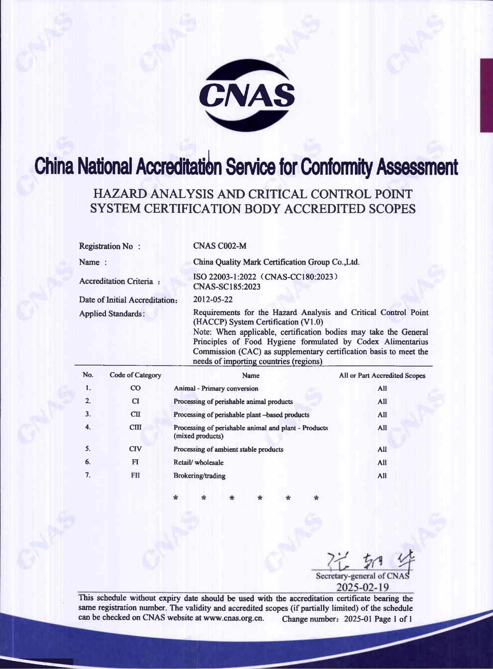 食品安全管理體系認可證書