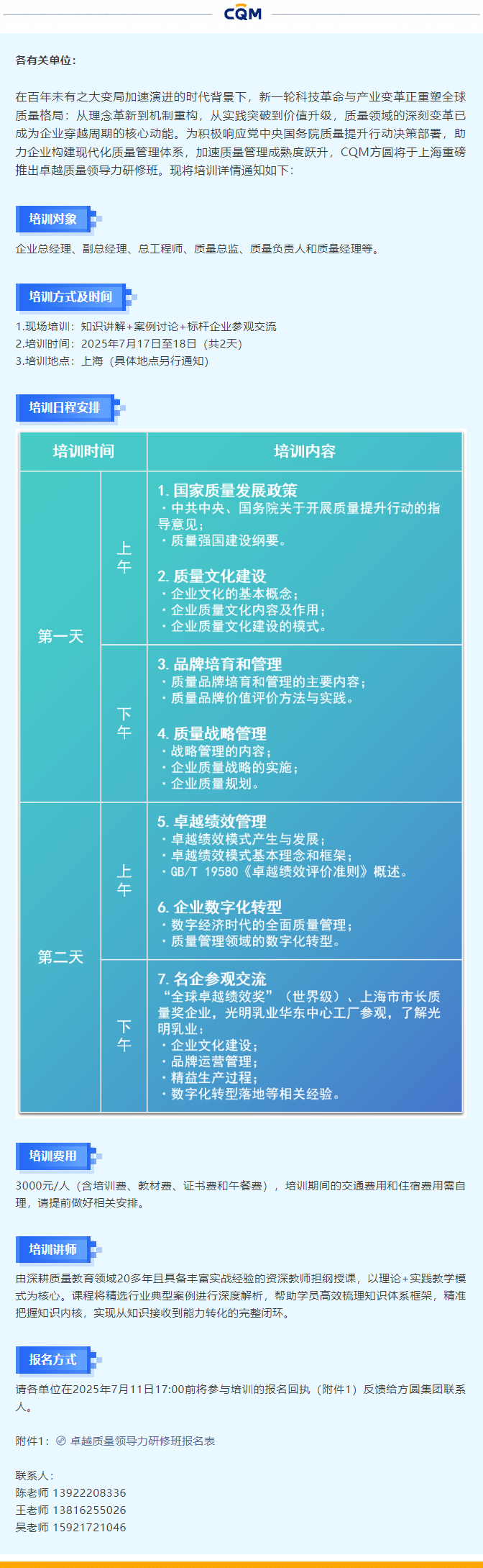 關于舉辦卓越質量領導力研修班的通知