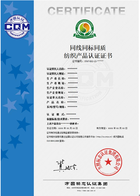 | 1 | 嬰幼兒產品 | STAT CQM24-1800-05-2022“同線同標同質”紡織產品認證實施規則 | STAT CQM2401-2022 “同線同標同質”紡織產品技術規范 |