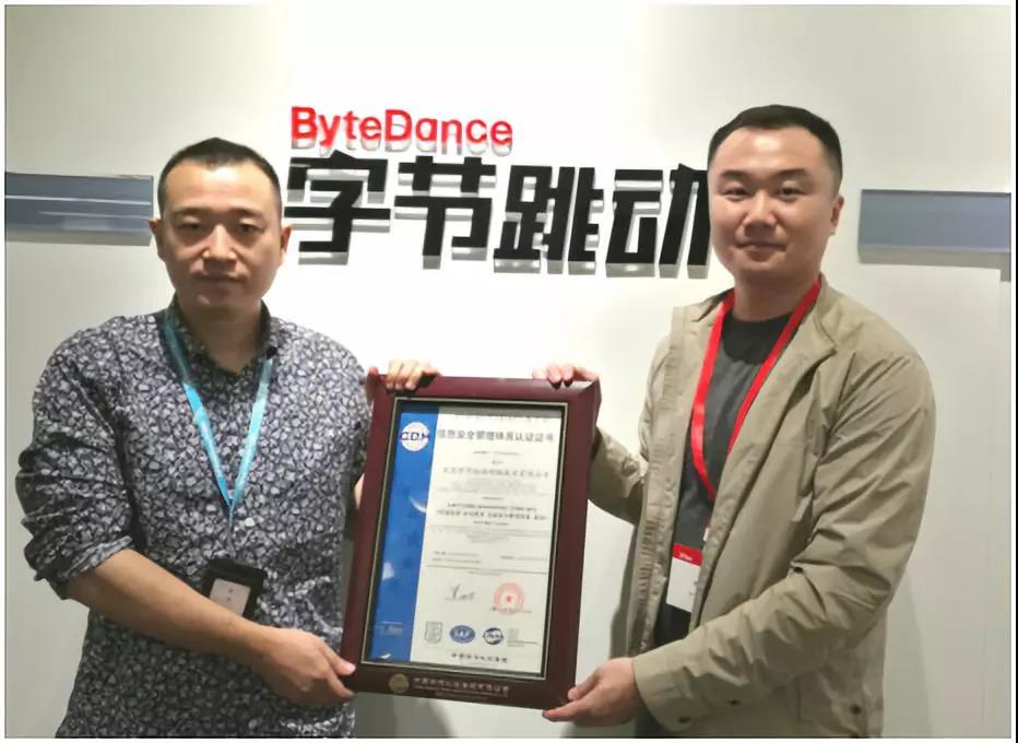 2018年10月9日,“今日頭條”、“西瓜視頻”、“火山小視頻”、“抖音短視頻”、“悟空問答”等APP軟件開發單位北京字節跳動科技有限公司、北京字節跳動網絡技術有限公司、北京微播視界科技有限公司三家單位順利通過方圓集團信息安全管理體系(ISMS)審核與審定,喜獲方圓集團頒發的信息安全管理體系認證證書。