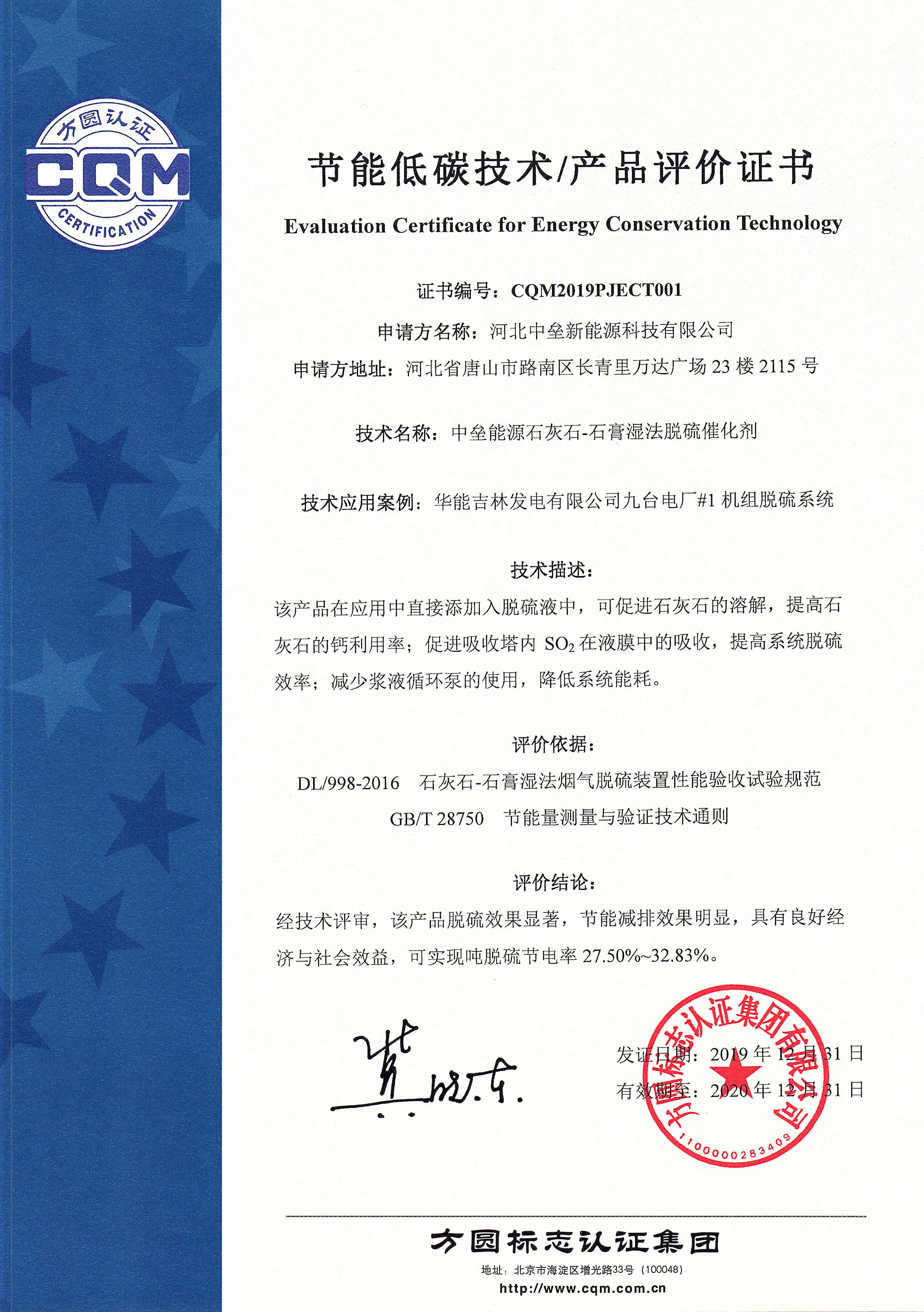 經文件審查、現場評價,該產品脫硫效果顯著,節(jié)能減排效果明顯,具有良好經濟與社會效益,可實現噸脫硫節(jié)電率27.50%~32.83%。