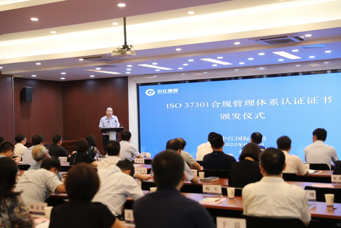 在證書頒發儀式上,劉險鋒副總裁代表方圓標志認證集團感謝江蘇省國資委的大力支持,感謝中江國際集團的信任,對中江國際集團多年來在合規管理方面的執著和努力,構建和實施符合ISO 37301國際標準的合規管理體系,獲得方圓認證表示熱烈的祝賀。在全球市場競爭中,持續強化企業合規已成為一項新趨勢。今年,國務院國資委相繼發布《關于開展中央企業“合規管理強化年”工作的通知》和《中央企業合規管理辦法(公開征求意見稿)》,對提升企業依法合規經營管理水平、切實防范風險、保障高質量發展發揮了積極作用。方圓標志認證集團作為與我國認證認可事業一同成長的老牌國有認證技術服務機構,同時開展了相關技術服務研究和工作推進,并承擔市場總局合規管理體系認證制度開發及《經營者公平競爭 合規管理體系建設規范》等相關國家標準的編寫工作,為快速服務于政府和企業提供了堅實的技術支持和保障。認證機構的使命是“傳遞信任、服務發展”,方圓標志認證集團將繼續秉承“鑒證優秀、成就卓越”一如既往地服務好中江國際,協助中江國際持續完善合規管理體系,支持各業務部門及所屬企業持續開展合規風險管控,不斷提高合規管理成熟度。