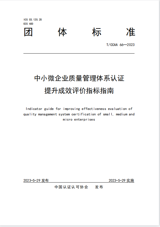 由中國認證認可協會組織,方圓標志認證集團等多家認證機構參與編寫的T/CCAA 66-2023《中小微企業質量管理體系認證提升成效評價指標指南》于2023年5月26日發布并實施。該標準適用于中小微企業質量管理體系認證提升成效的評價,為中小微企業高質量發展帶來真正的促進作用。